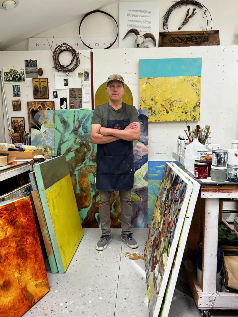 Bruce’s written work is published in many books and journal articles, and his most recent book Makers by Nature was released by IVP Academic Press in 2025. His writing and paintings are featured in other major volumes including A Broken Beauty (Eerdmans, 2006), Magnificat (2006), QU4RTETS (2013), Through Your Eyes (monograph on Herman with Eerdmans, 2013), and in several art surveys like 100 Boston Painters (Shiffer); Religion and Contemporary Art (Routledge); and Art & Soul (Piquant UK). He has been artist-in-residence at several institutions, including Duke Divinity School where he completed a major commission for the school. He has led numerous retreats and workshops and has spoken at many national venues. He taught studio art and curated exhibitions at Gordon College in Wenham, Massachusetts for nearly forty years, where he held the college’s first endowed faculty appointment. Bruce completed both BFA and MFA degrees at Boston University College of Fine Arts under American artists Philip Guston, James Weeks, David Aronson, Reed Kay, and Arthur Polonsky.