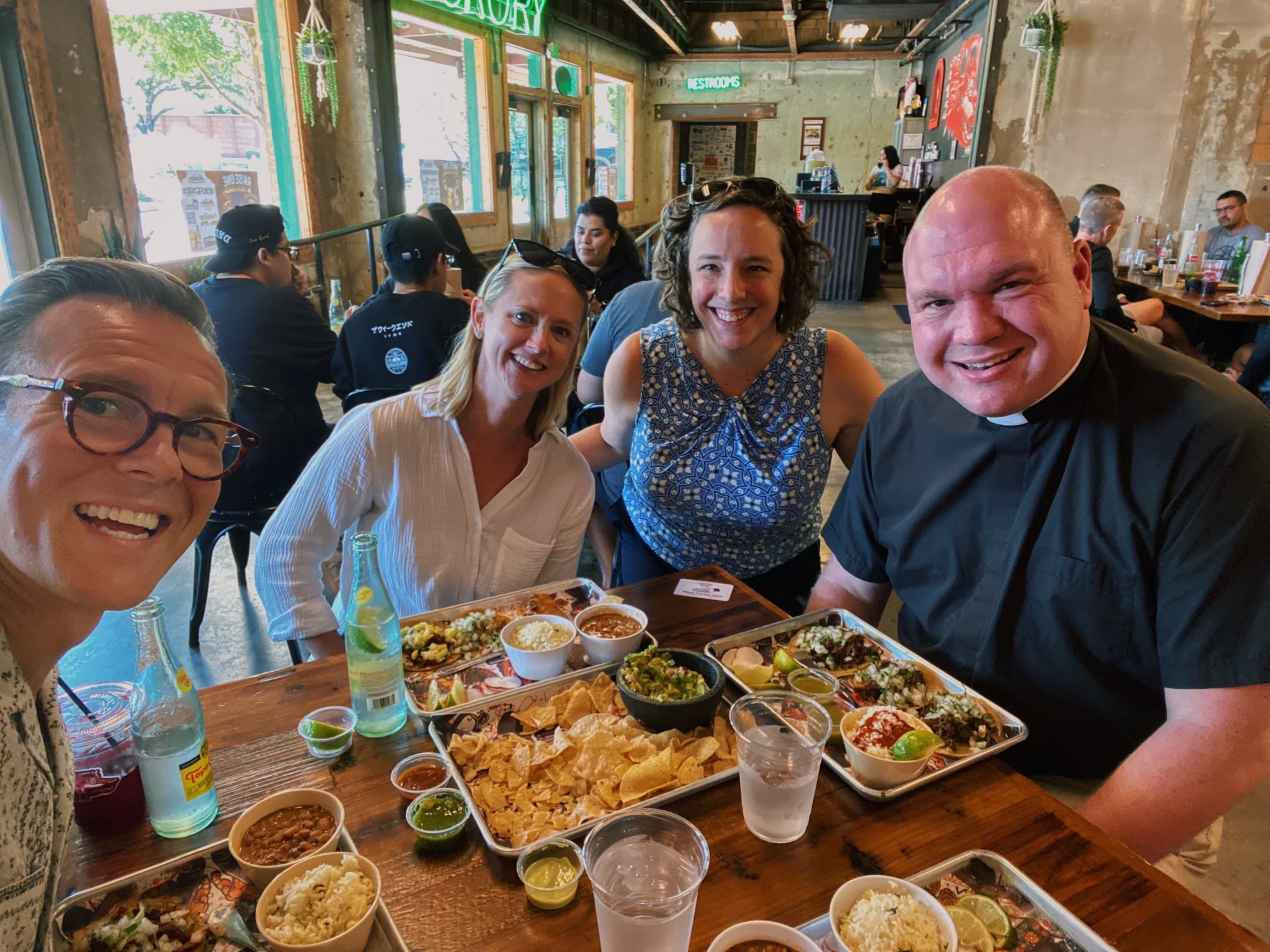Fr. Paul Wheatley, Robin Little, Dr. Lauren Whitnah, and Fr. Paul Nesta grab a meal in Dallas.